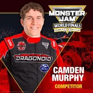 Camden Murphy (Born July 23rd, 1996) is a monster truck driver out of Itasca, Illinois. He is the driver of Classroom Crusher. Before then, he was the driver of Pirate's Curse from 2017-2018, and Bakugan Dragonoid from 2019-2024.