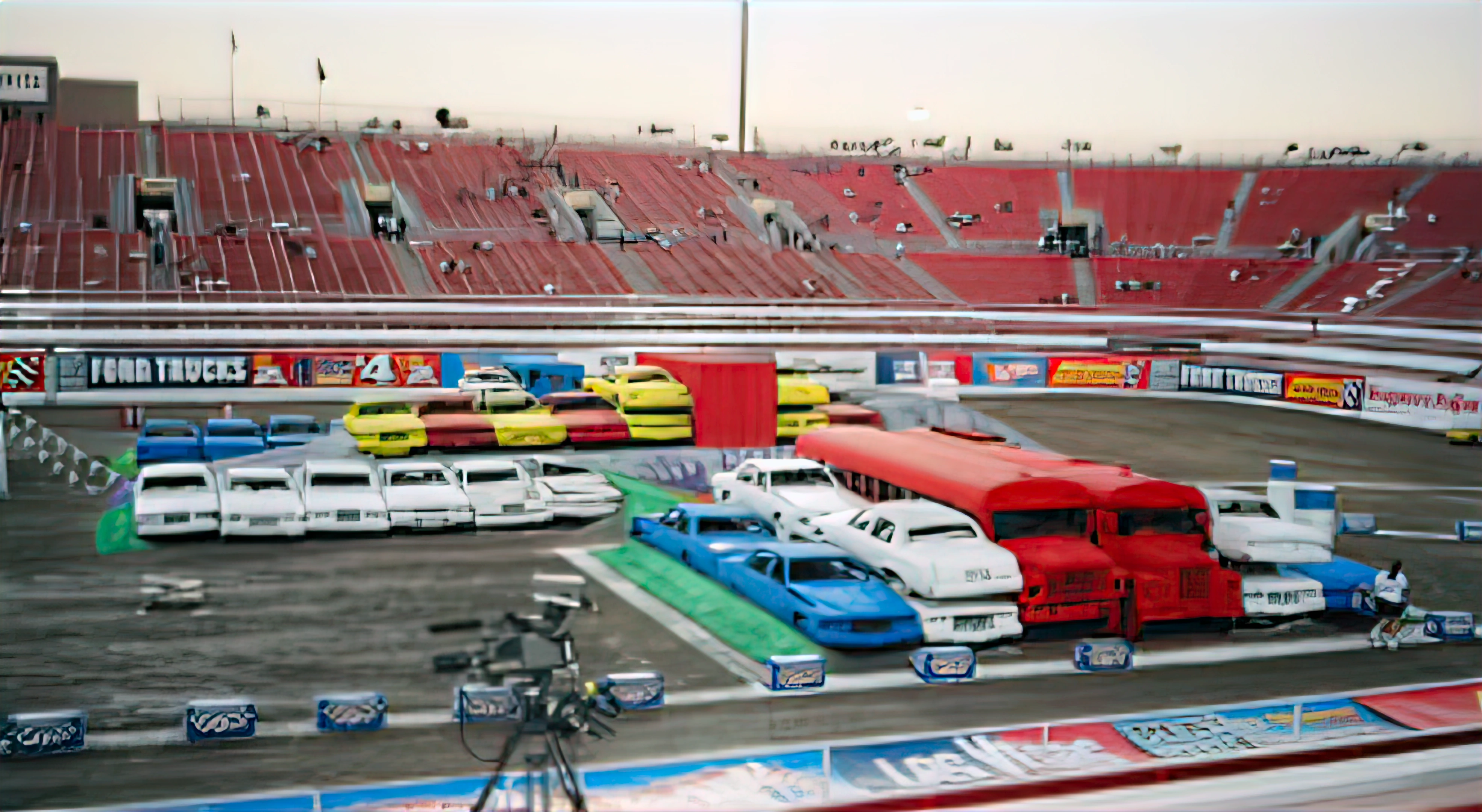 The freestyle layout included a rock pile and bus stack on the left, a rail-car jump on the center, and a box van stack and 30 foot tall trailer on the right with a camper added towards the far end and the trailer/bed combo in the right lane.