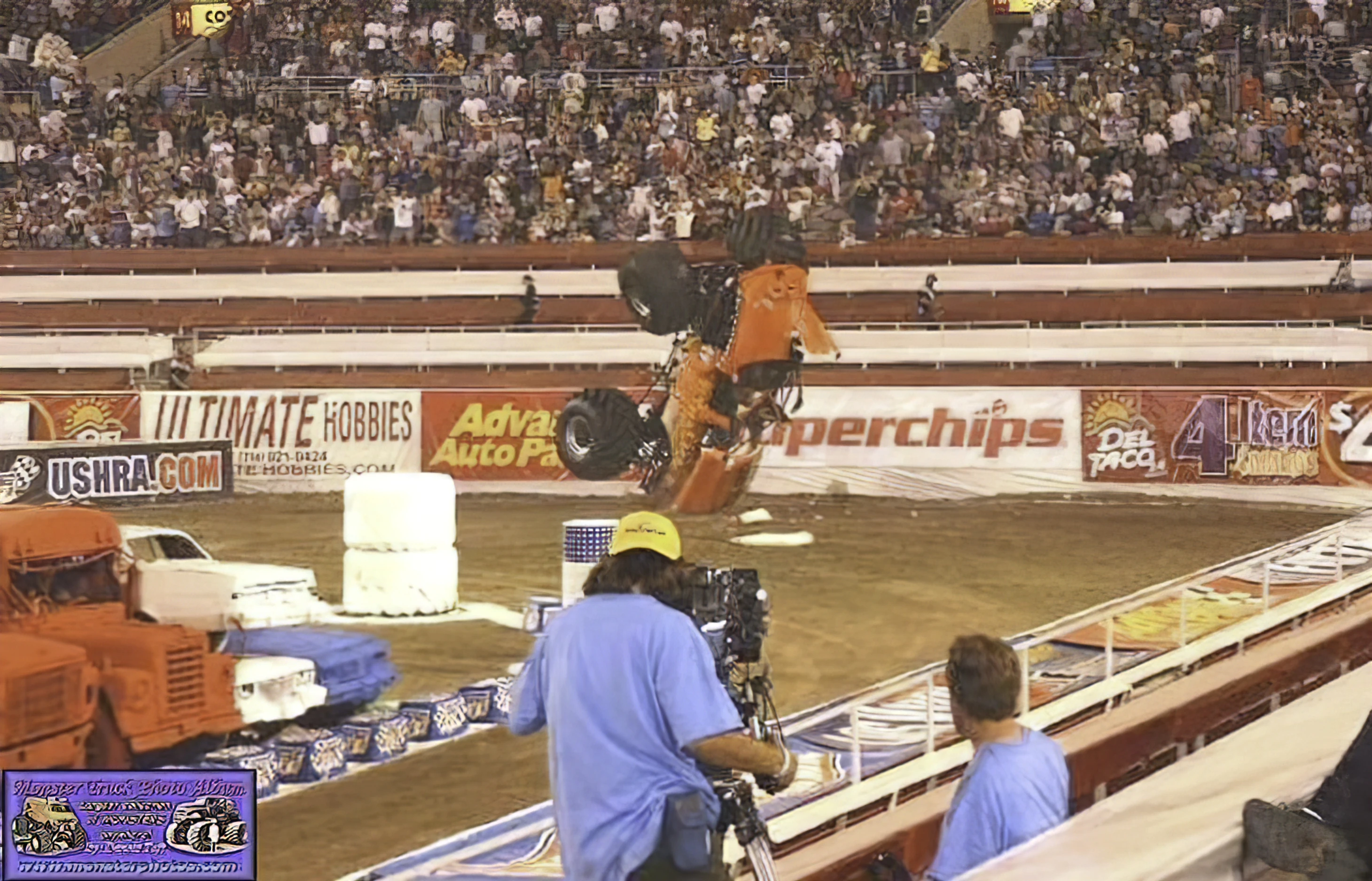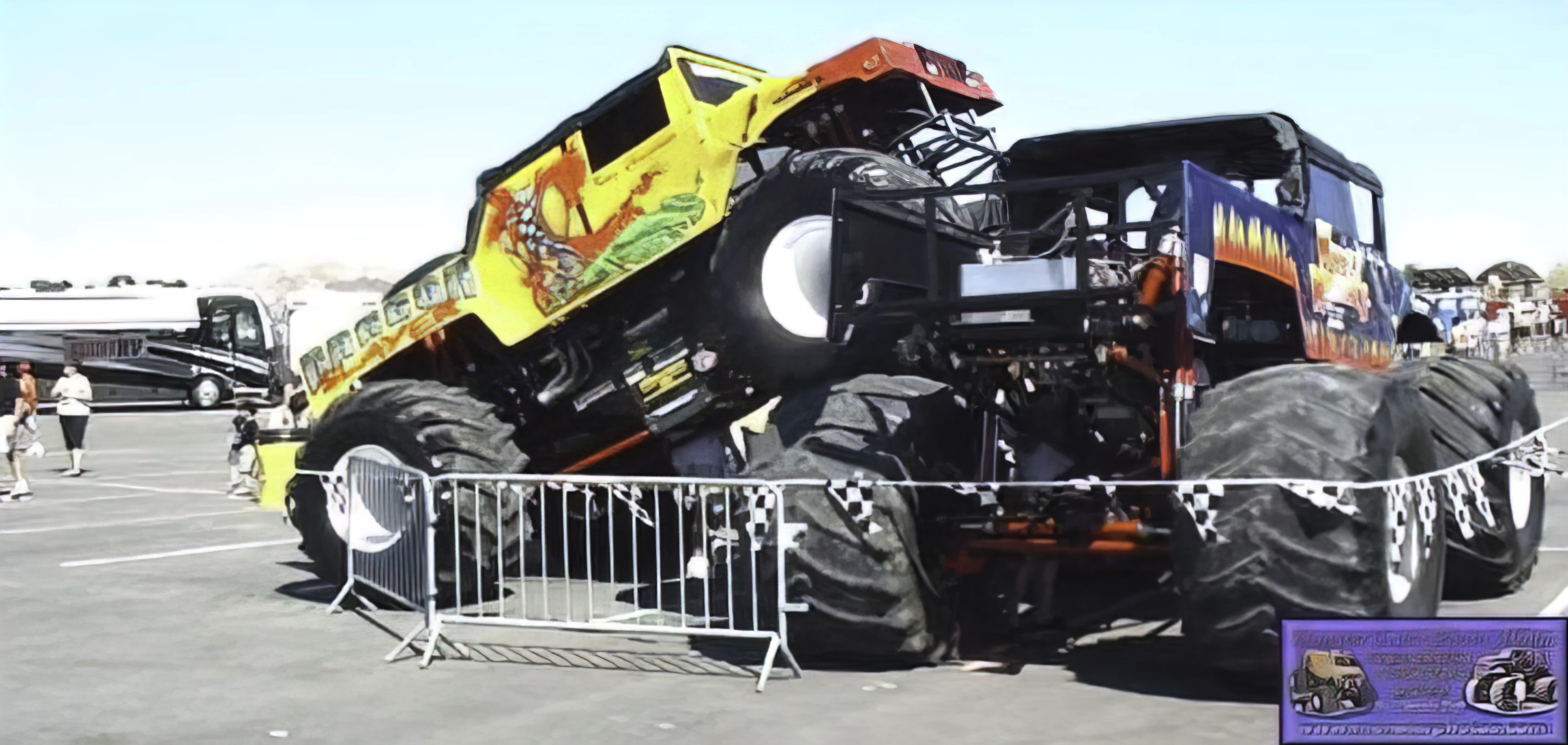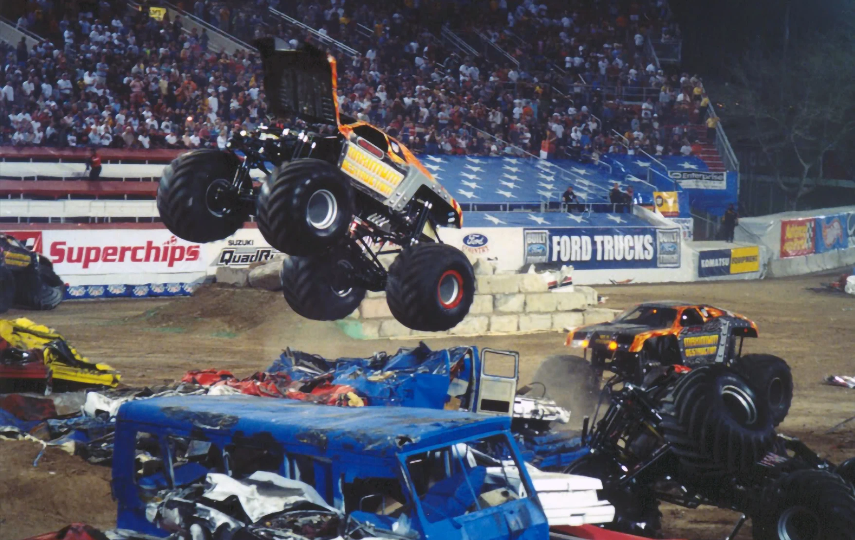 The third Blue Thunder (the one that lost its hood) in the encore was run on the Advance Auto Parts Metal Monster chassis, and the third Maximum Destruction (rear-engined) was run on the Ameriquest Freedom/Demolition Man chassis.