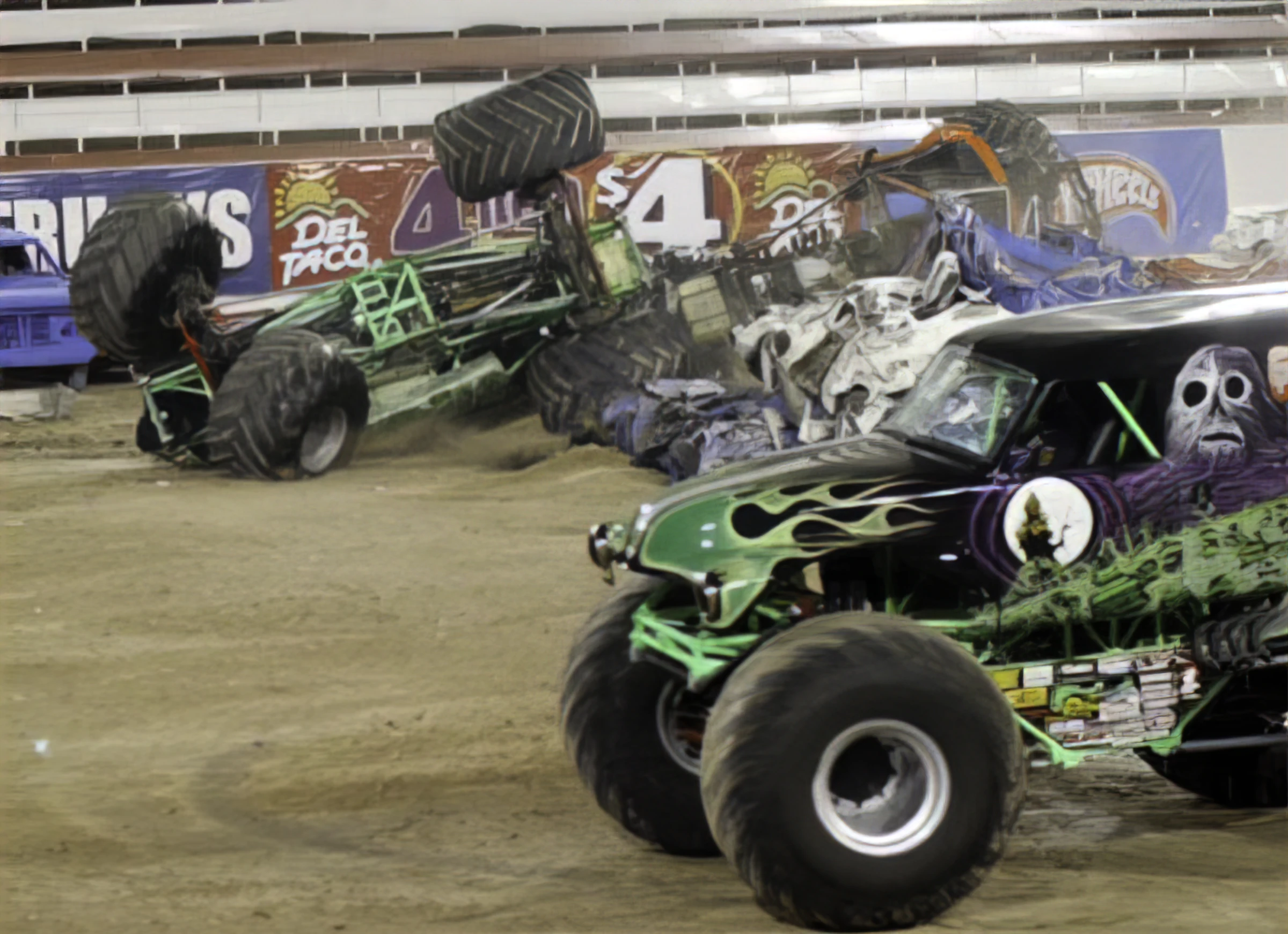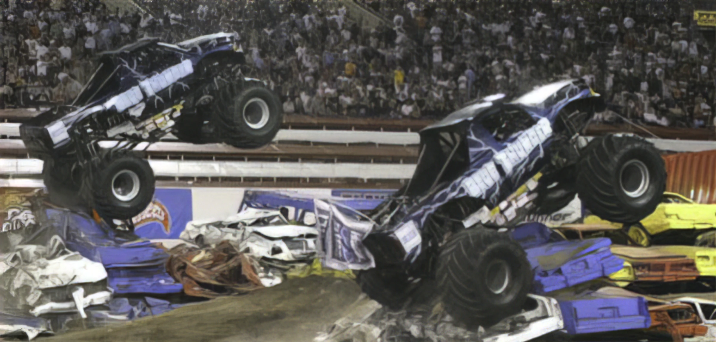 Teenage Mutant Ninja Turtles actually had two crashes in freestyle, even though only one was shown on the DVD. It was implied that Teenage Mutant Ninja Turtles crashed in the first 30 seconds, but did not continue, but actually did continue and crashed again (Remember: this World Finals had the rule where a truck could resume, if possible, if they rolled in the first 30 seconds of freestyle).