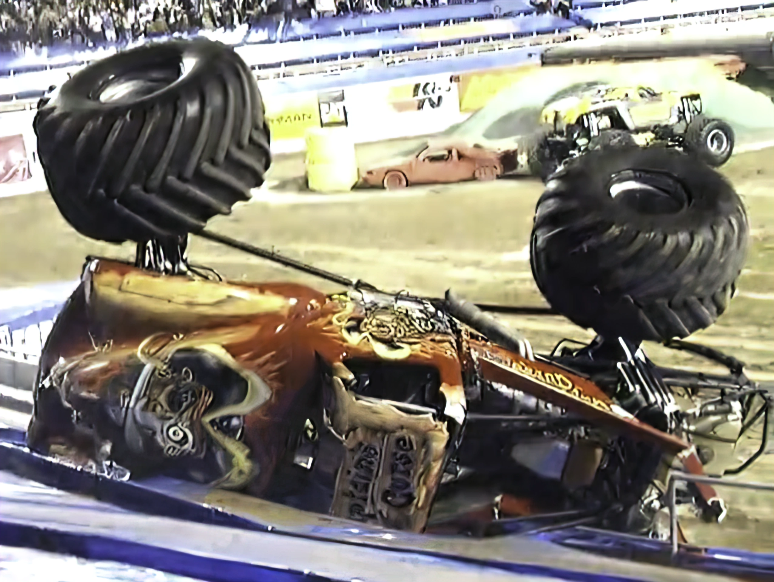 During the championship race, Captain's Curse violently tumbled into the stadium seats and landed about 15 feet from spectators and only about 10 feet from a camera operator. Though the cause of the crash for several years has been believed to be the result of a stuck throttle, YouTube user Who's Ready for Monster Jam (who was in attendance at the event) revealed in a November 2024 video that the actual cause of the crash was due to faulty brakes on Captain's Curse and the negligence of officials.
