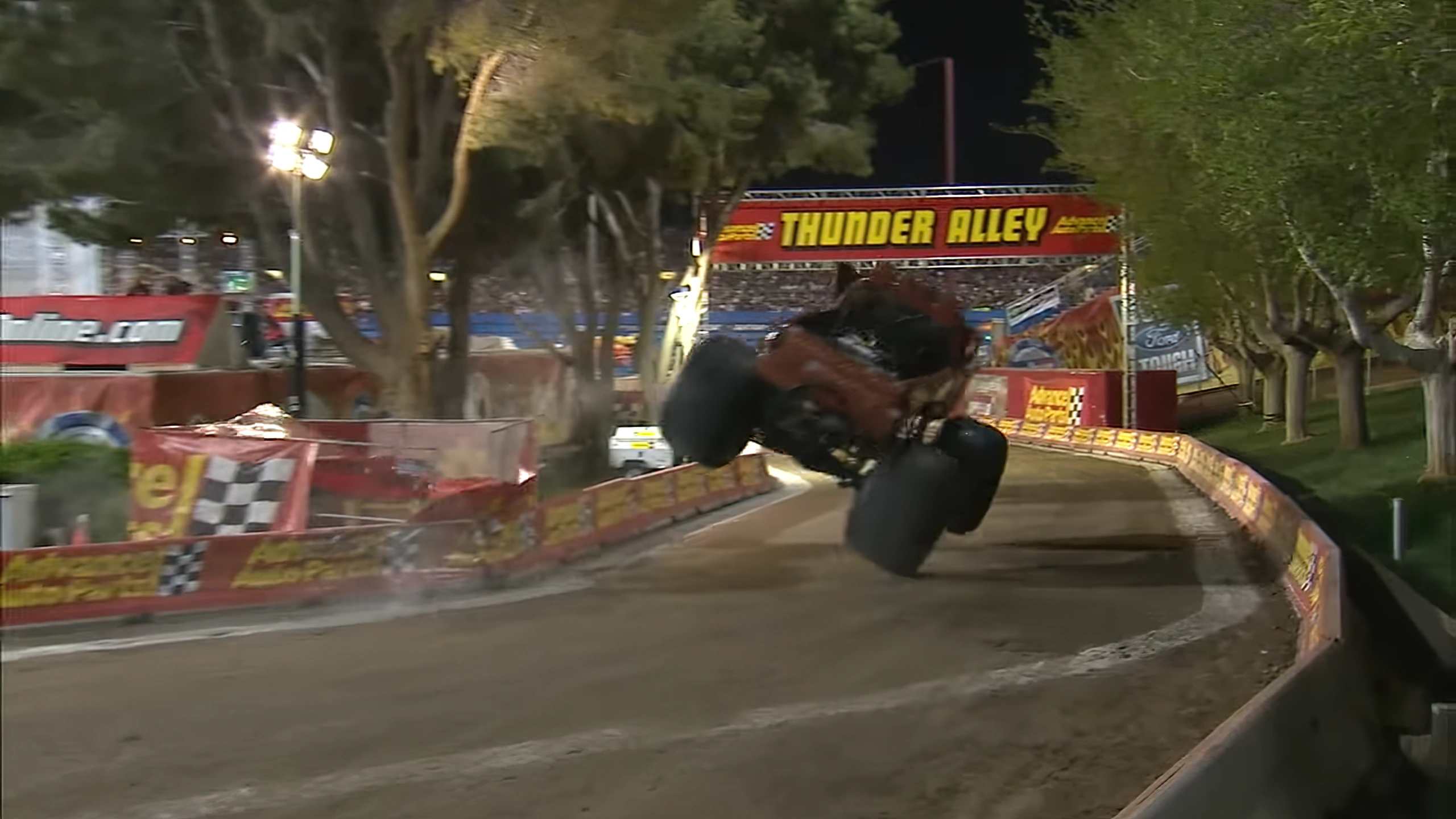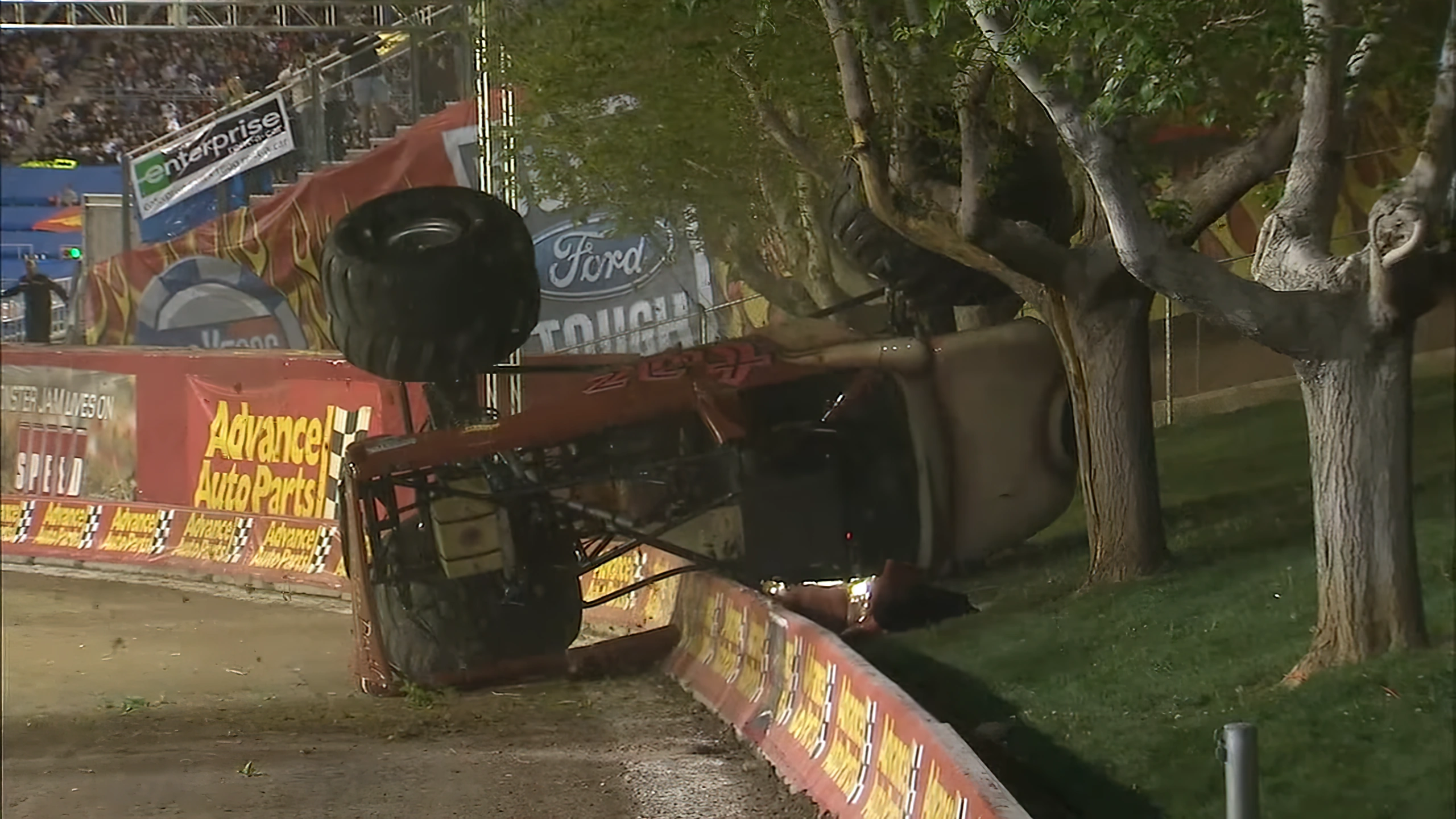 Captain's Curse, Nitro Circus, and Grave Digger all crashed into the stands during the course of the event (Captain's Curse flipped violently into the stands after losing brakes in the championship race, while Nitro Circus and Grave Digger both rolled onto the wall during freestyle). Captain's Curse's racing crash was omitted from the vast majority of TV broadcasts and from the DVD; Nitro Circus' and Grave Digger's crashes were only shown through onboard footage.